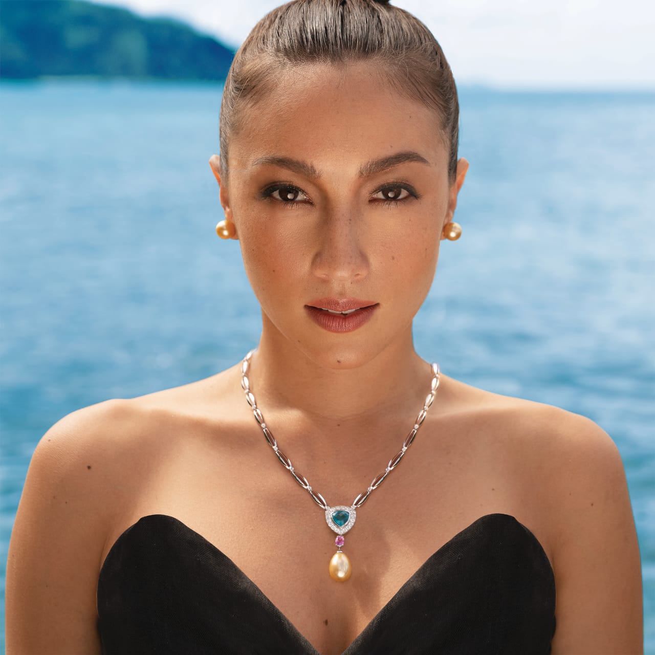 Recalling this state of wonder, soft curves starred with diamonds emulate the waves as they dance and glisten. The interplay of pink sapphire and blue apatite creates a harmony of color and energy that intensifies the radiance of its crowning gem – the golden South Sea pearl.