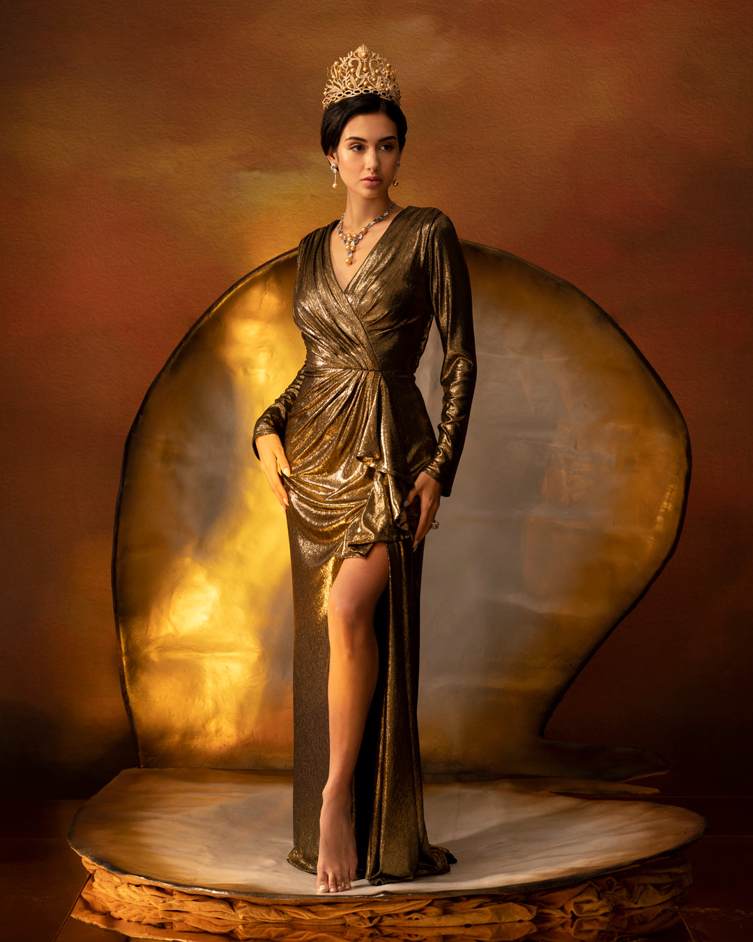Adorned in exquisite creations from the La Mer en Majesté collection, she embodies the effervescent charm of the golden South Sea pearl — her sparkling beauty glittering like brilliant treasures from the depths of the sea.