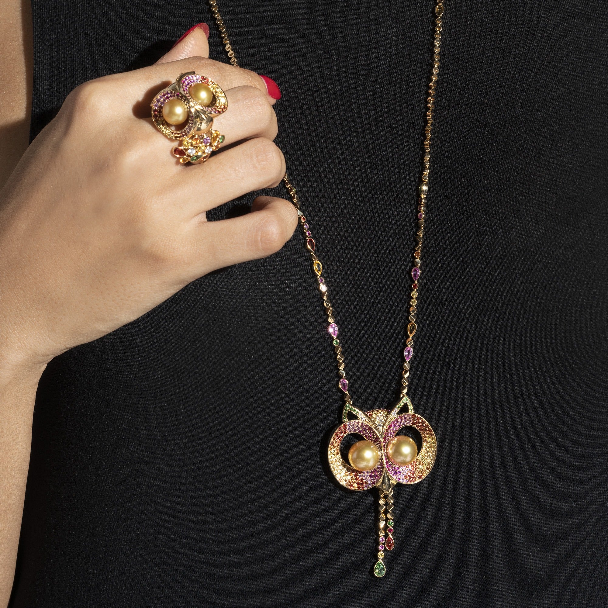 At its heart, Belle de Nuit is a playful contemplation on the life and color abound in the tapestry of night. The collection, captivating with its vibrant precious stones and golden South Sea pearls, is a celebration of the nocturnal magic that brings fantasies and possibilities to life.