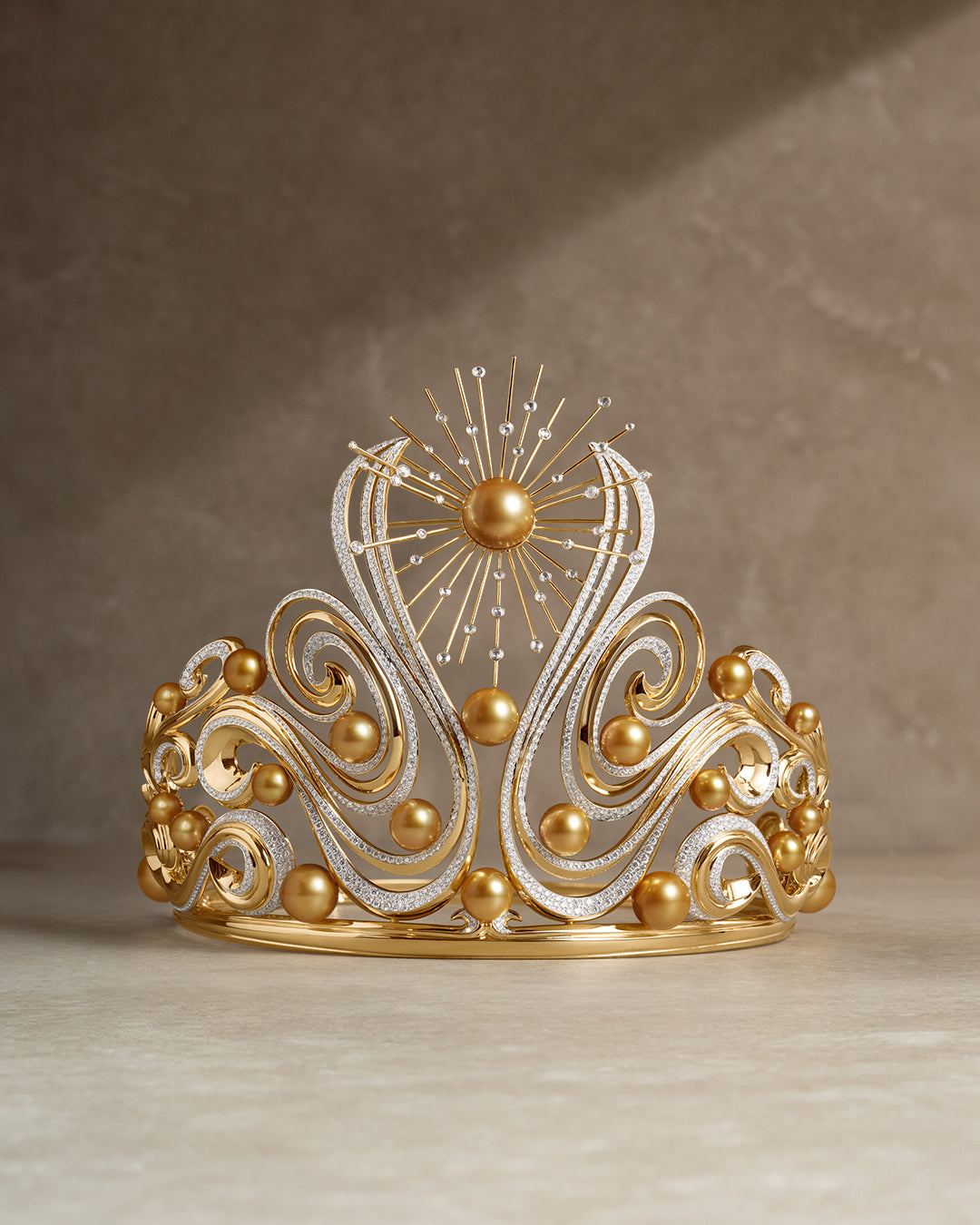 Universal elements are brought together in harmony, united through a crown made with a passion for creativity and innovation. Light and fire emanate from the sun, as depicted by the diamond-adorned rays and the warmth of precious yellow gold. Tendrils of diamonds and rich gold recall the seafoam meeting the shores and the air blowing on the waves. Golden South Sea pearls evoke the sphere of the Earth, radiating beauty from the ocean, our source of life, to the whispers and promises of the universe and its infinite beyond.
