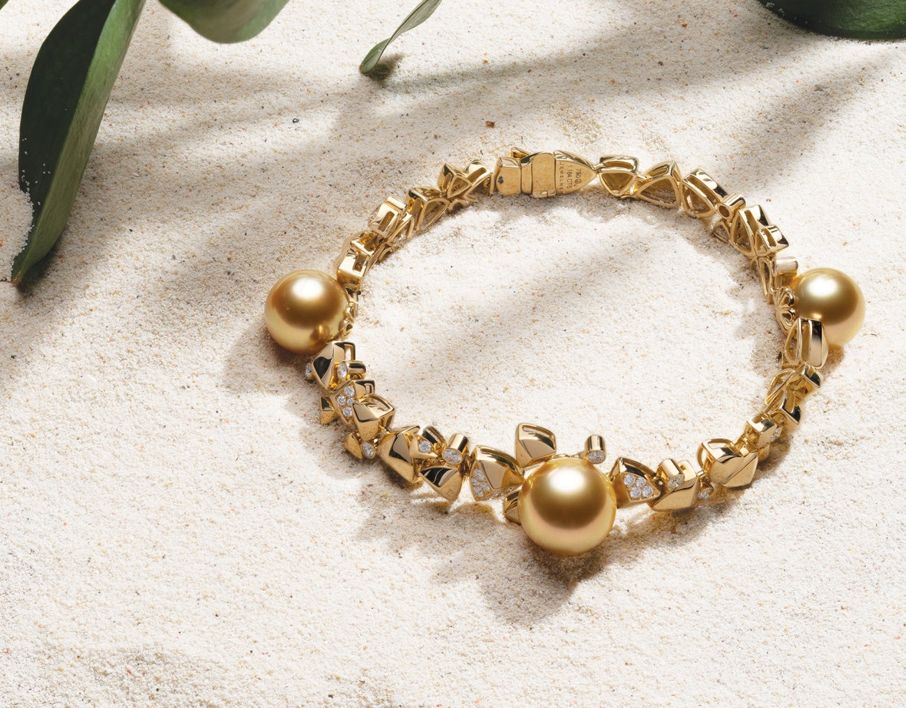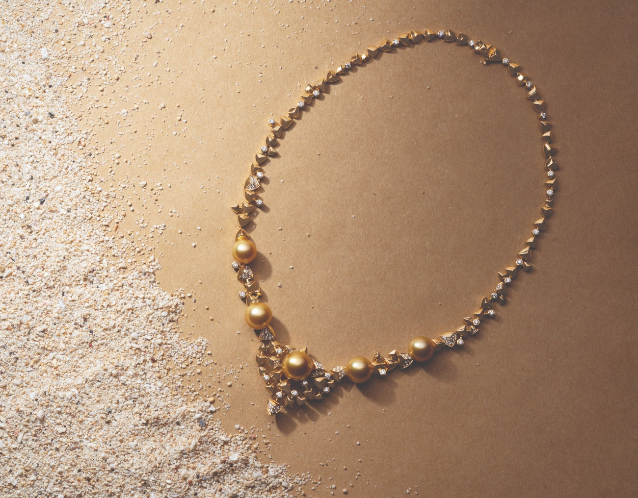 Arranged in playful composition, the Berlingot necklace evokes the bliss of youth. The poetic union of lustrous gold, brilliant diamonds, and vibrant golden South Sea pearls captures the golden sweetness of unforgettable summer days.