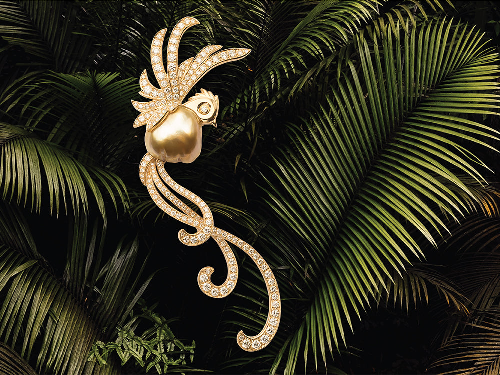 With the body of the bird formed through the playful shape of a baroque pearl and its plumage reimagined in colored stones, luminous pieces introduce each wearer to inspired flights of the imagination.