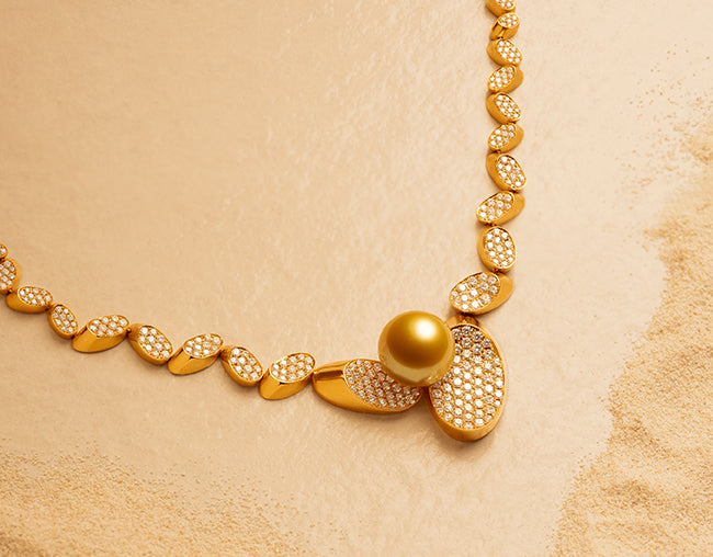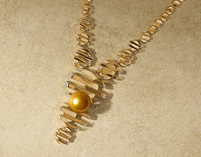 In the elegant assembly of pearls resting on a backdrop of diamonds and gold, each piece portrays a Zen garden, where pebbles, light, and water conjure serenity and mystique.